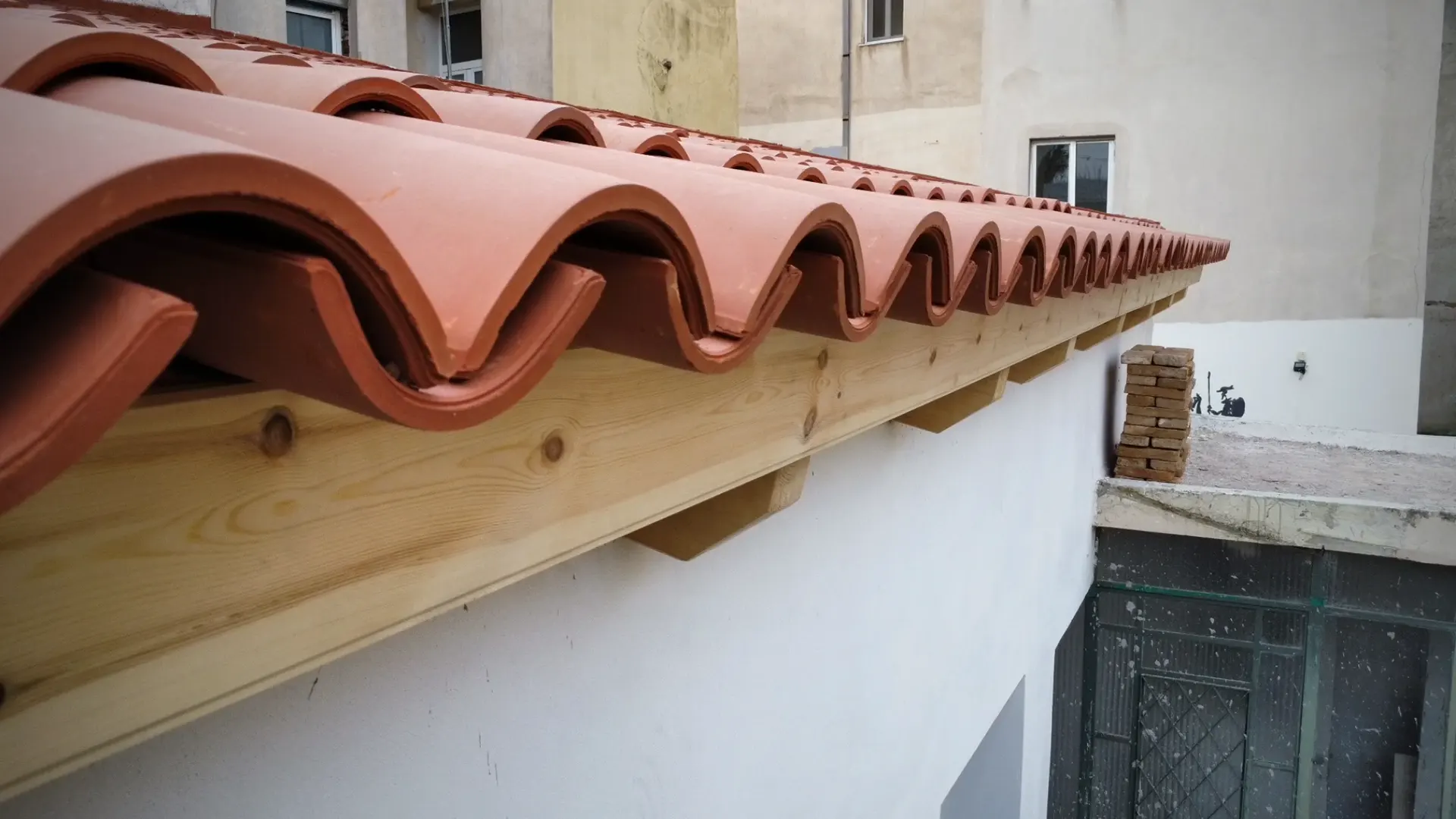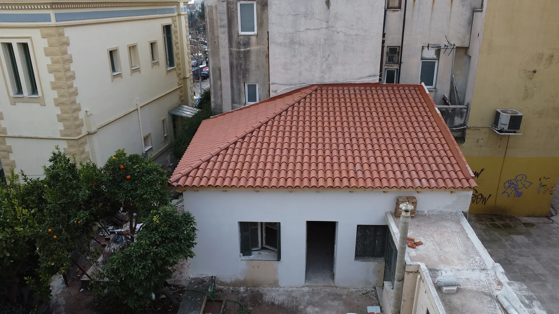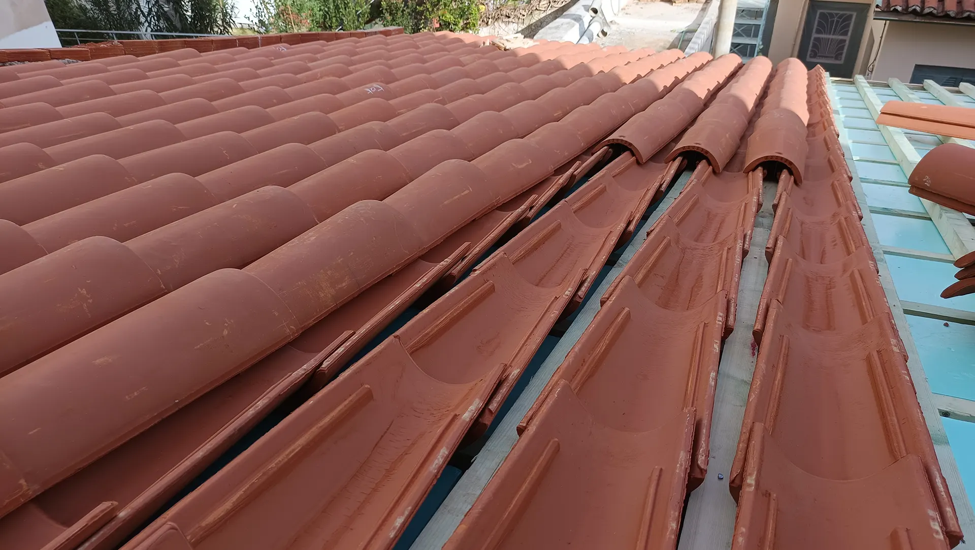 Τοποθέτηση στέγης με βυζαντινό κόκκινο κεραμίδι και εμφανή σκελετό στο Μαρούσι.