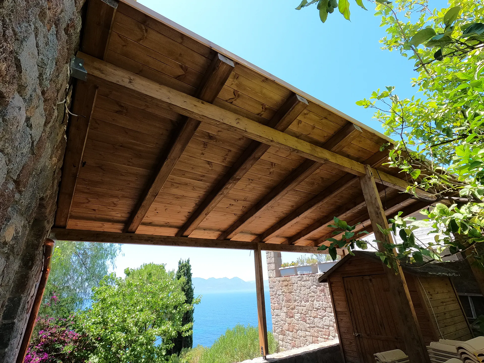 Η ξύλινη πέργκολα με κίτρινα κεραμίδια δίνει έναν κλασικό και στιβαρό χαρακτήρα στον εξωτερικό χώρο, προσφέροντας πλήρη προστασία από τον ήλιο και τη βροχή, ενώ το θερμό χρώμα των κεραμιδιών συνδυάζεται αρμονικά με τη φυσική παλέτα της αυλής. Από την άλλη, η πέργκολα με καλάμι λυγαριάς δημιουργεί μια πιο ανάλαφρη και ημιδιαφανή σκίαση, ιδανική για καλοκαιρινές ημέρες, αφήνοντας το φως να διαχέεται ευχάριστα και διατηρώντας δροσιά. Και στις δύο κατασκευές χρησιμοποιήθηκε ποιοτική ξυλεία και παραδοσιακή τεχνική τοποθέτησης, με έμφαση στη λεπτομέρεια και την αντοχή στον χρόνο. Το αποτέλεσμα είναι ένας εξωτερικός χώρος με δυνατότητες πολλαπλής χρήσης — από ήσυχες στιγμές χαλάρωσης μέχρι φιλοξενία και καθημερινές οικογενειακές συγκεντρώσεις.