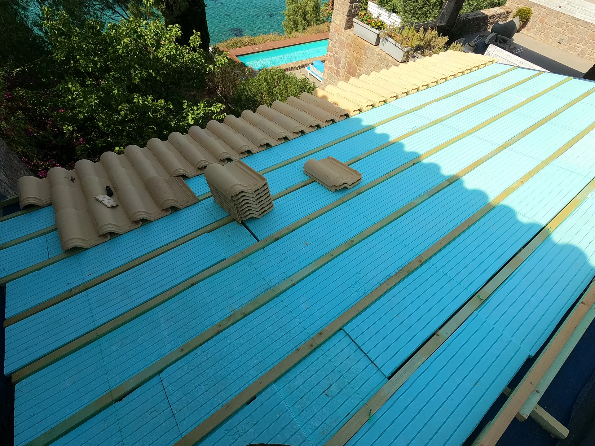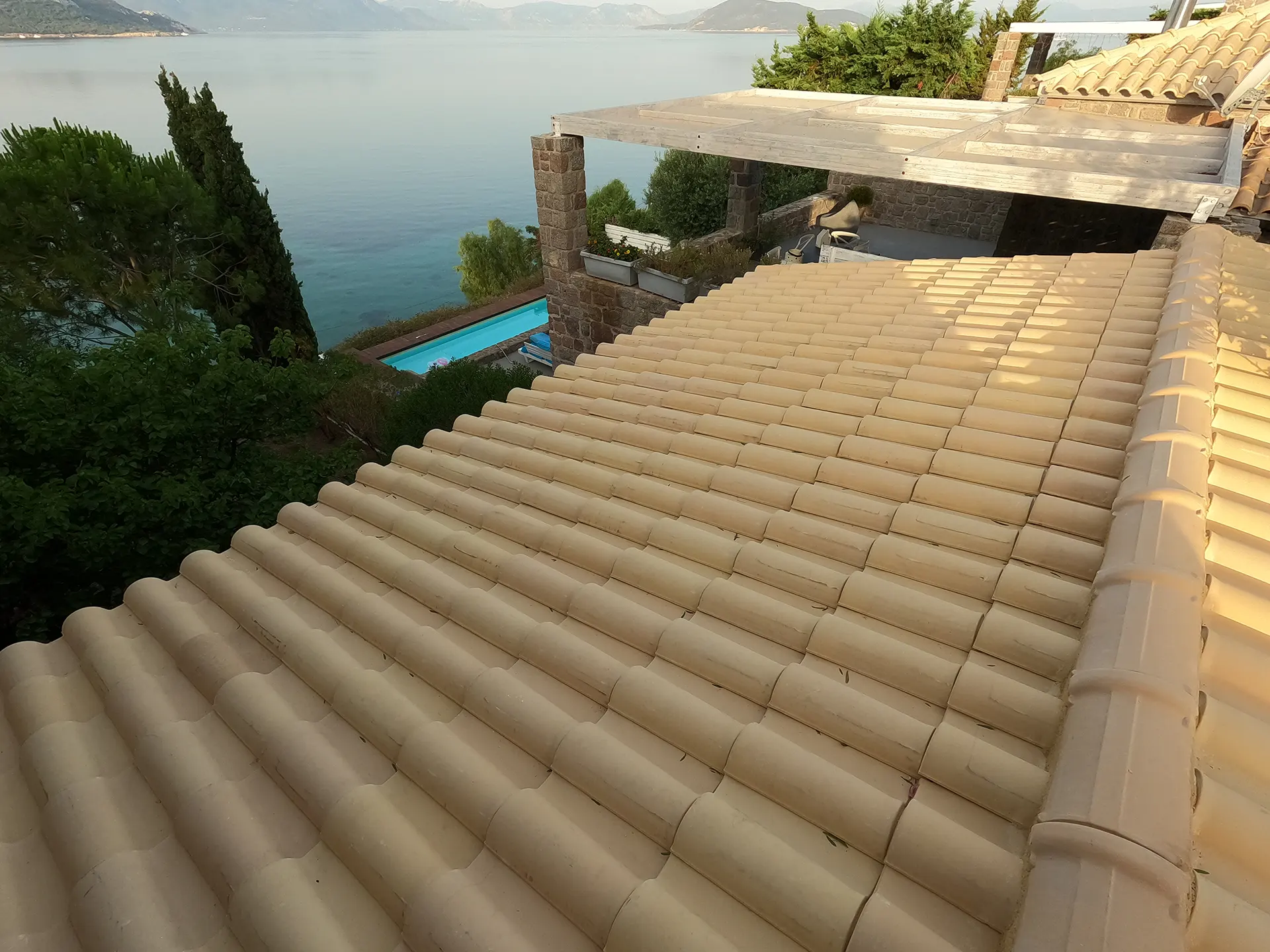 Κατασκευή πέργκολας με κίτρινα κεραμίδια ρωμαϊκού τύπου και πέργκολας με καλάμι λυγαριάς σε αυλή κατοικίας στην Αίγινα.