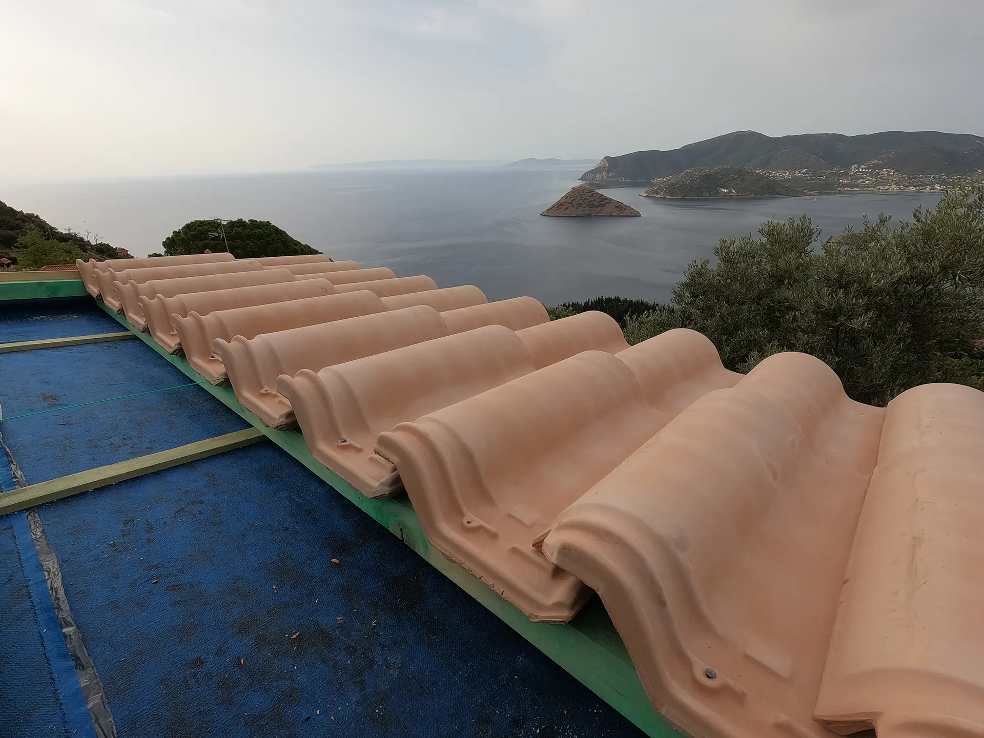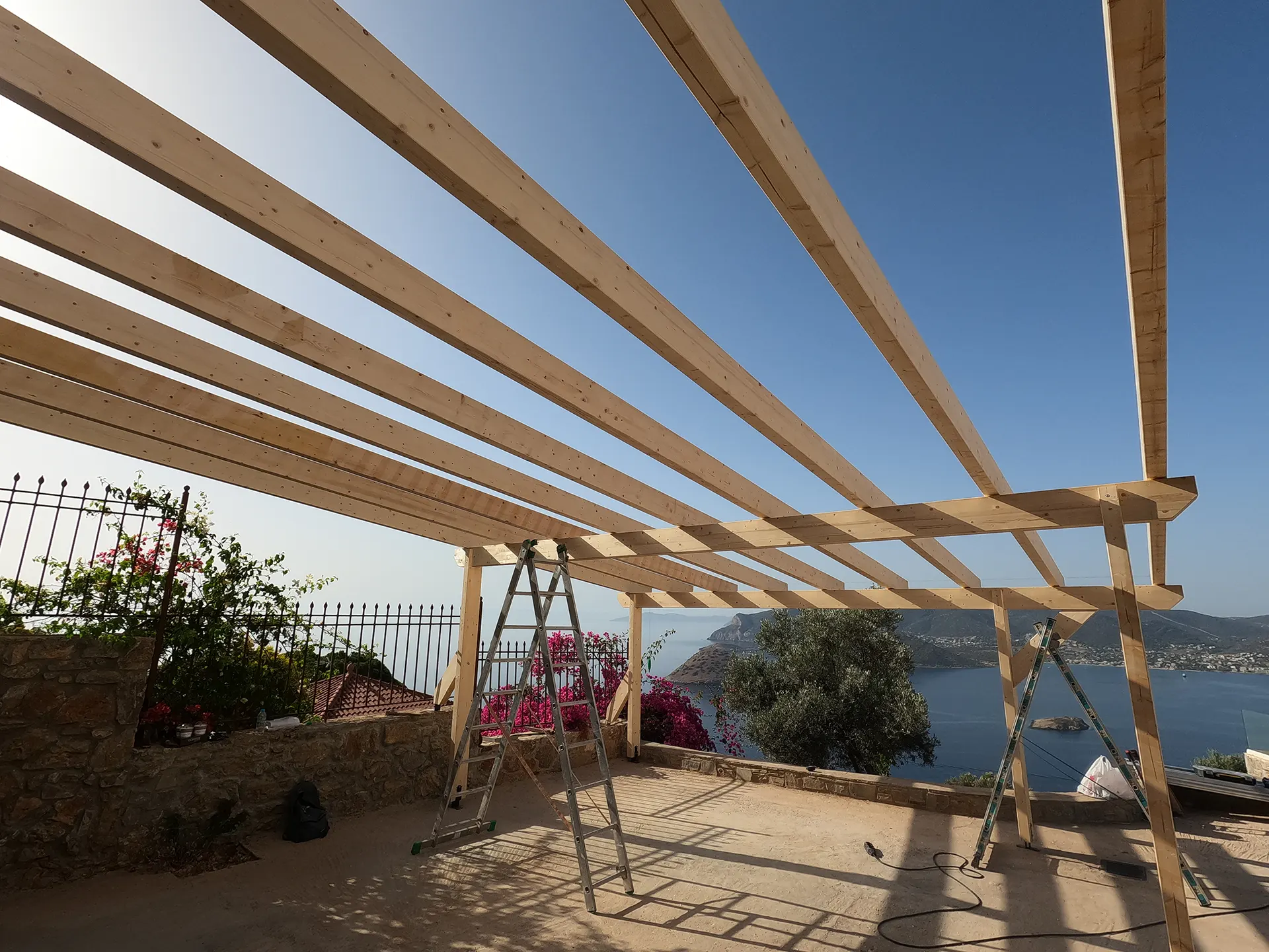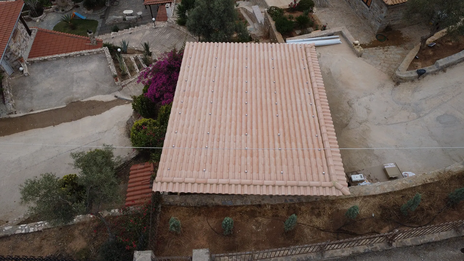 Κατασκευή πέργκολας για χώρο στάθμευσης με φυσικό ροζ κεραμίδι ρωμαϊκού τύπου σε αυλή κατοικίας στο Πόρτο Ράφτη.