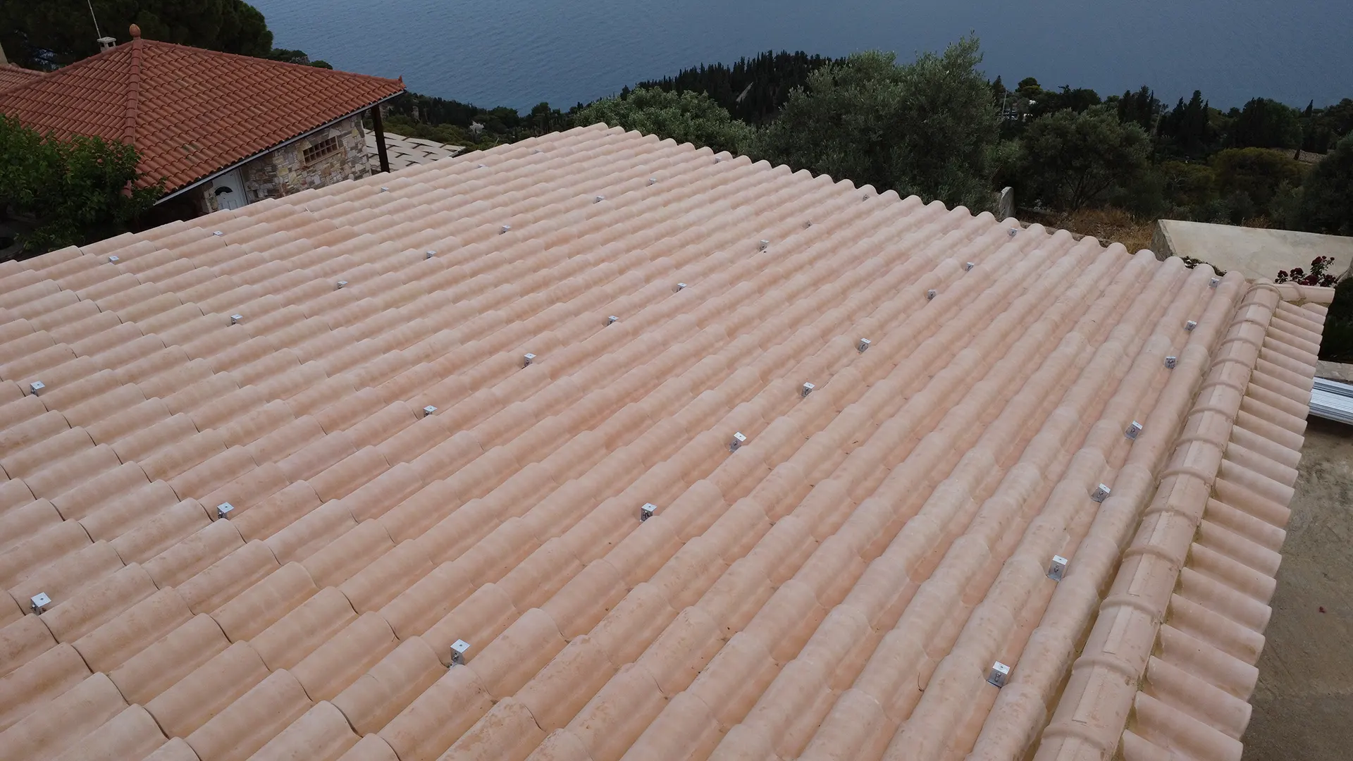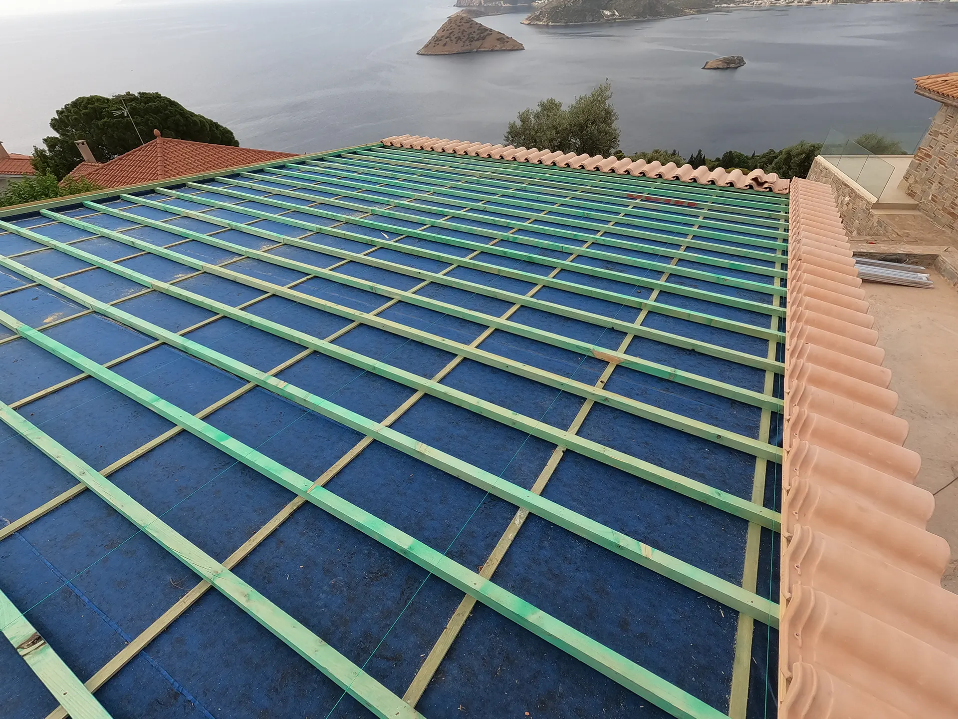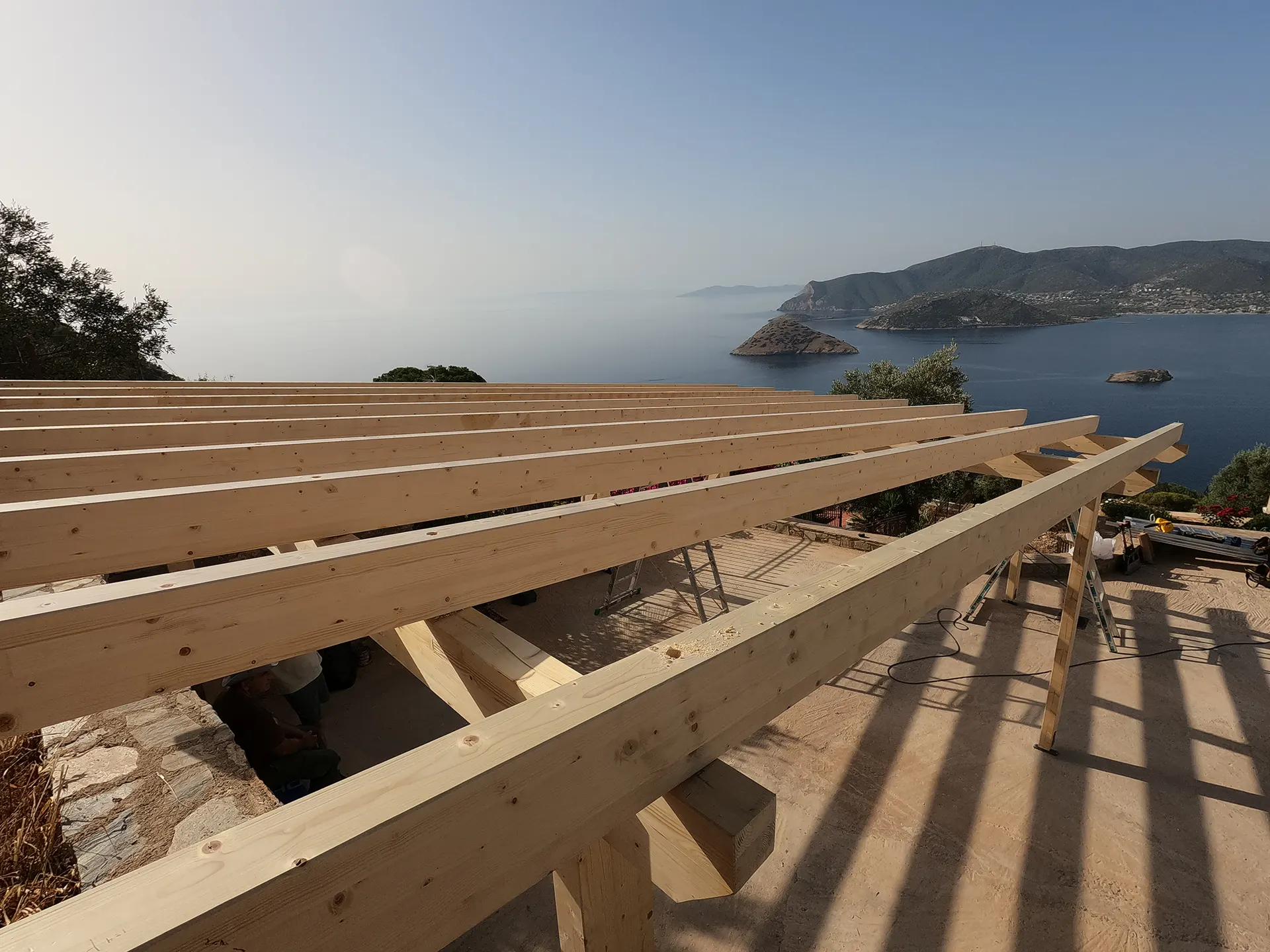 Κατασκευή πέργκολας για χώρο στάθμευσης με φυσικό ροζ κεραμίδι ρωμαϊκού τύπου σε αυλή κατοικίας στο Πόρτο Ράφτη.