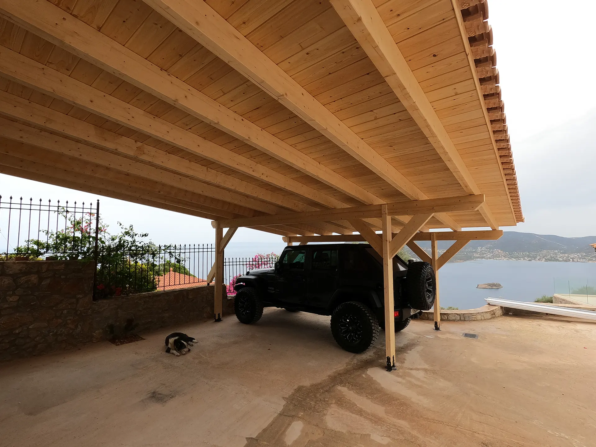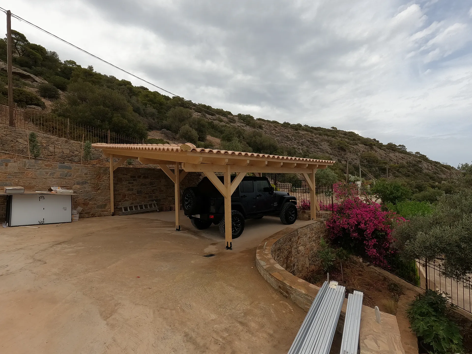 Η πέργκολα σχεδιάστηκε έτσι ώστε να εξυπηρετεί απόλυτα τον πρακτικό ρόλο της κάλυψης του οχήματος, ενώ ταυτόχρονα ενσωματώνεται φυσικά στην αρχιτεκτονική της κατοικίας. Το ροζ κεραμίδι, φυσικό και ανεπιτήδευτο, δημιουργεί μια ζεστή και γήινη αίσθηση, ιδιαίτερα ταιριαστή με το φως και τα χρώματα της περιοχής. Ο ξύλινος σκελετός, κατασκευασμένος από ανθεκτική, υψηλής ποιότητας ξυλεία, διατηρήθηκε εμφανής, αναδεικνύοντας τη φυσική υφή του υλικού και την αυθεντικότητα της κατασκευής. Το αποτέλεσμα είναι ένα λειτουργικό και καλαίσθητο σκέπαστρο, που δεν λειτουργεί μόνο ως προστασία από τον ήλιο και τις καιρικές συνθήκες, αλλά αναβαθμίζει συνολικά τον εξωτερικό χώρο της κατοικίας.