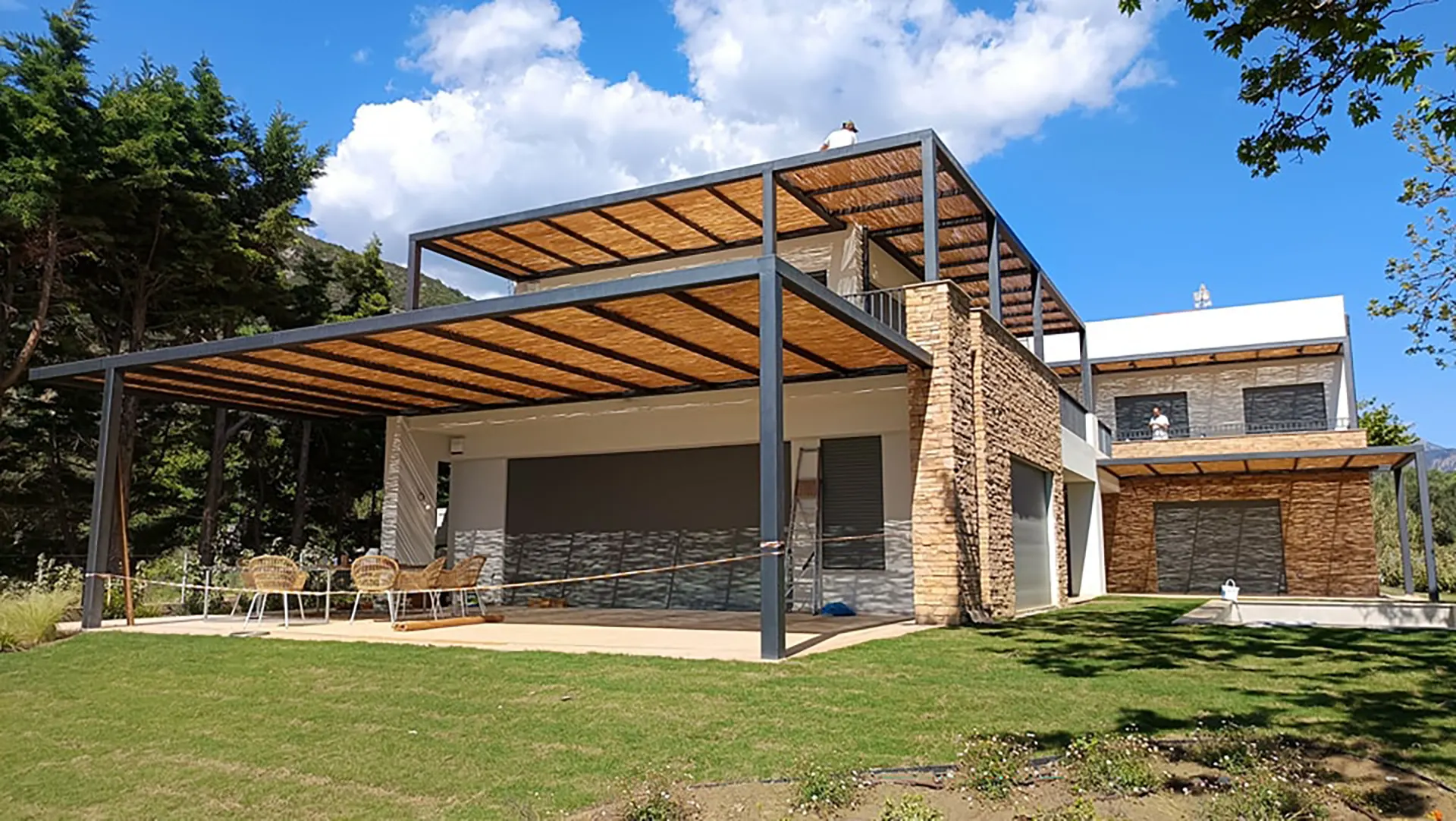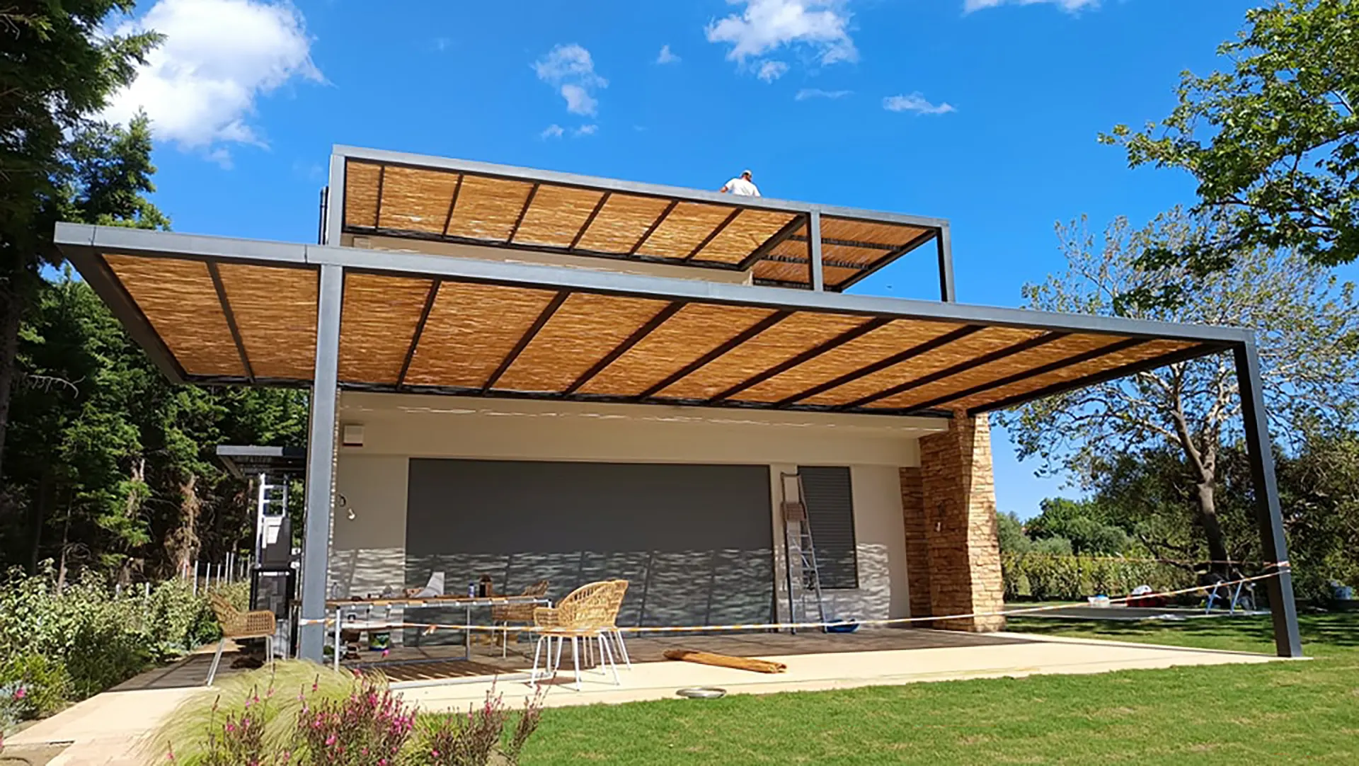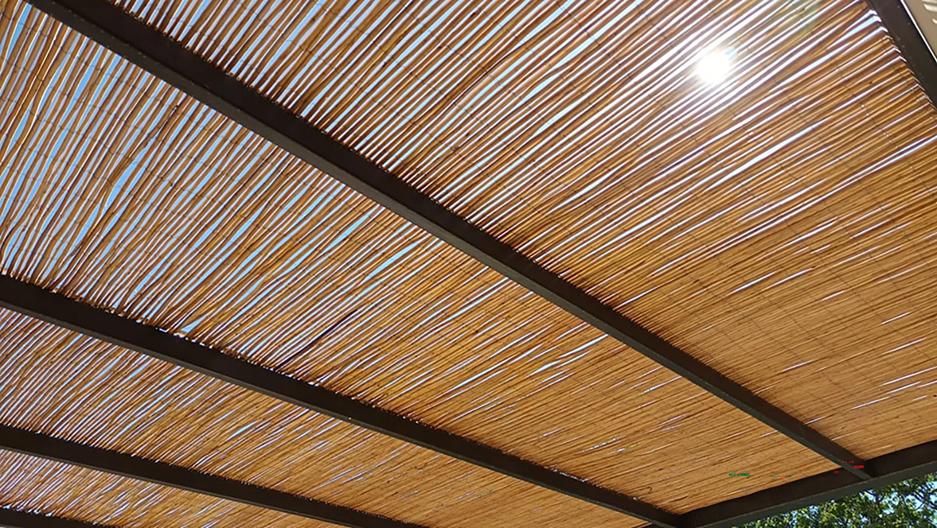 Τα καλάμια λυγαριάς, ως υλικό, φέρνουν την αίσθηση της φύσης στον υπαίθριο χώρο, προσφέροντας σκίαση, διακριτικότητα και αερισμό, ενώ ταυτόχρονα δένουν αρμονικά με το τοπίο της περιοχής. Η παρέμβαση έγινε με ιδιαίτερη προσοχή ώστε να συνδυαστεί ο μεταλλικός σκελετός με τη φυσικότητα του καλαμιού, διατηρώντας την αντοχή της κατασκευής αλλά και αναβαθμίζοντας την αισθητική της. Το αποτέλεσμα είναι μια πέργκολα ανάλαφρη, ευχάριστη στο μάτι και ιδανική για καλοκαιρινούς μήνες, που προσφέρει σκιά χωρίς να βαραίνει τον χώρο. Ιδανική επιλογή για όσους επιθυμούν πρακτικότητα με φυσικό χαρακτήρα.
