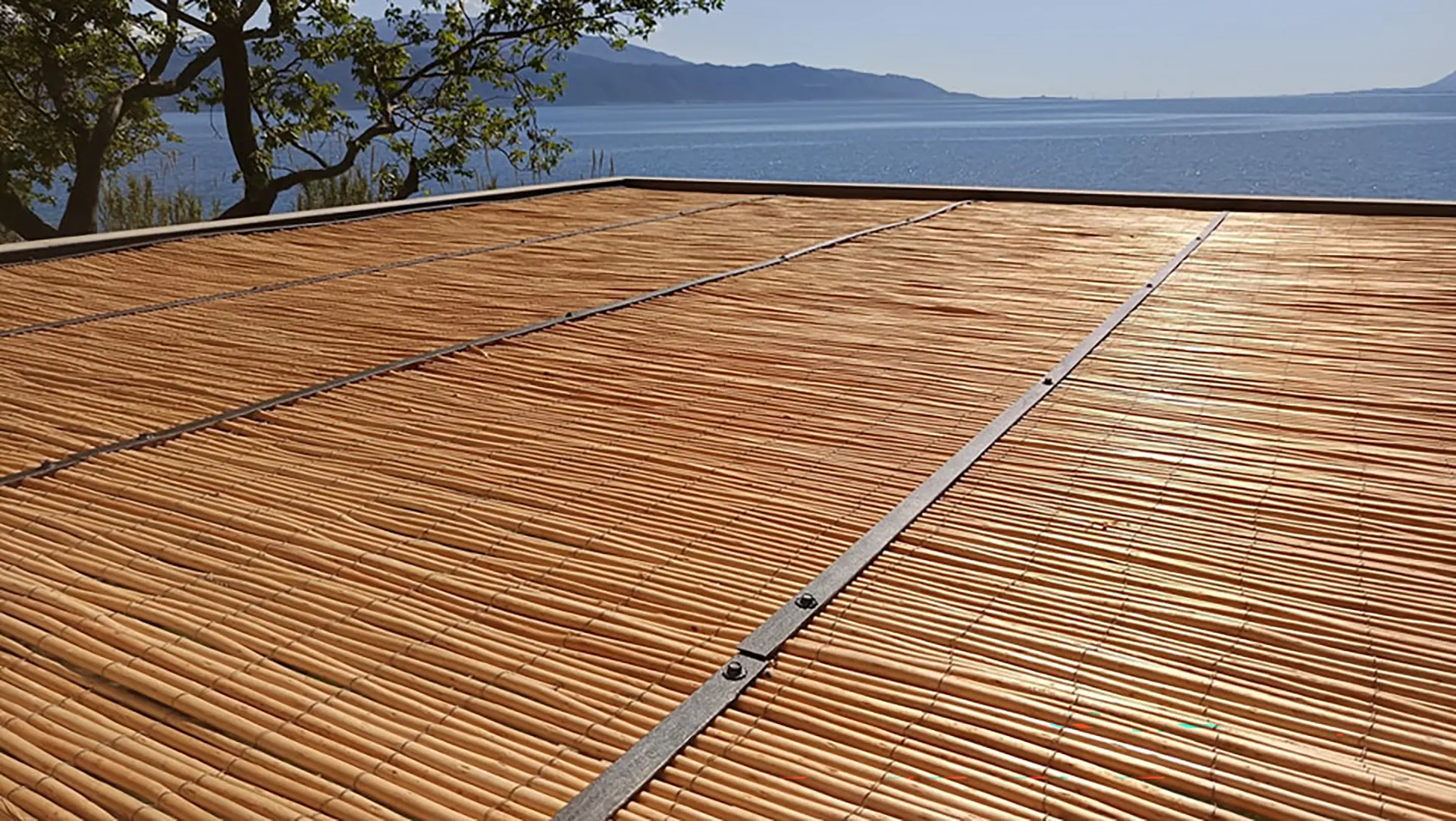Στη Ναύπακτο, αναλάβαμε την επένδυση υπάρχουσας μεταλλικής πέργκολας με φυσικά καλάμια λυγαριάς, δημιουργώντας έναν δροσερό και φιλόξενο χώρο σκίασης με φυσική υφή και μεσογειακή αισθητική.