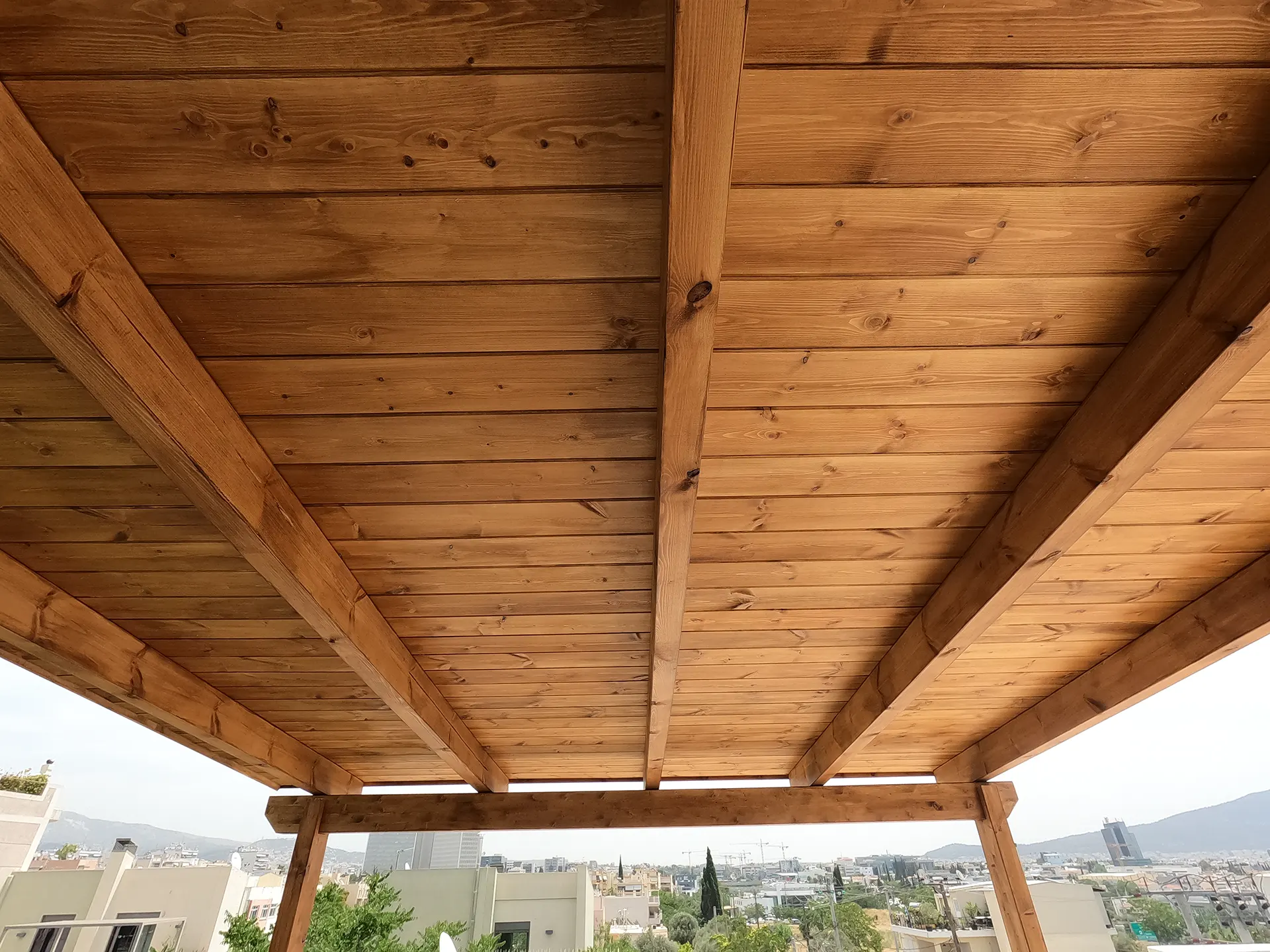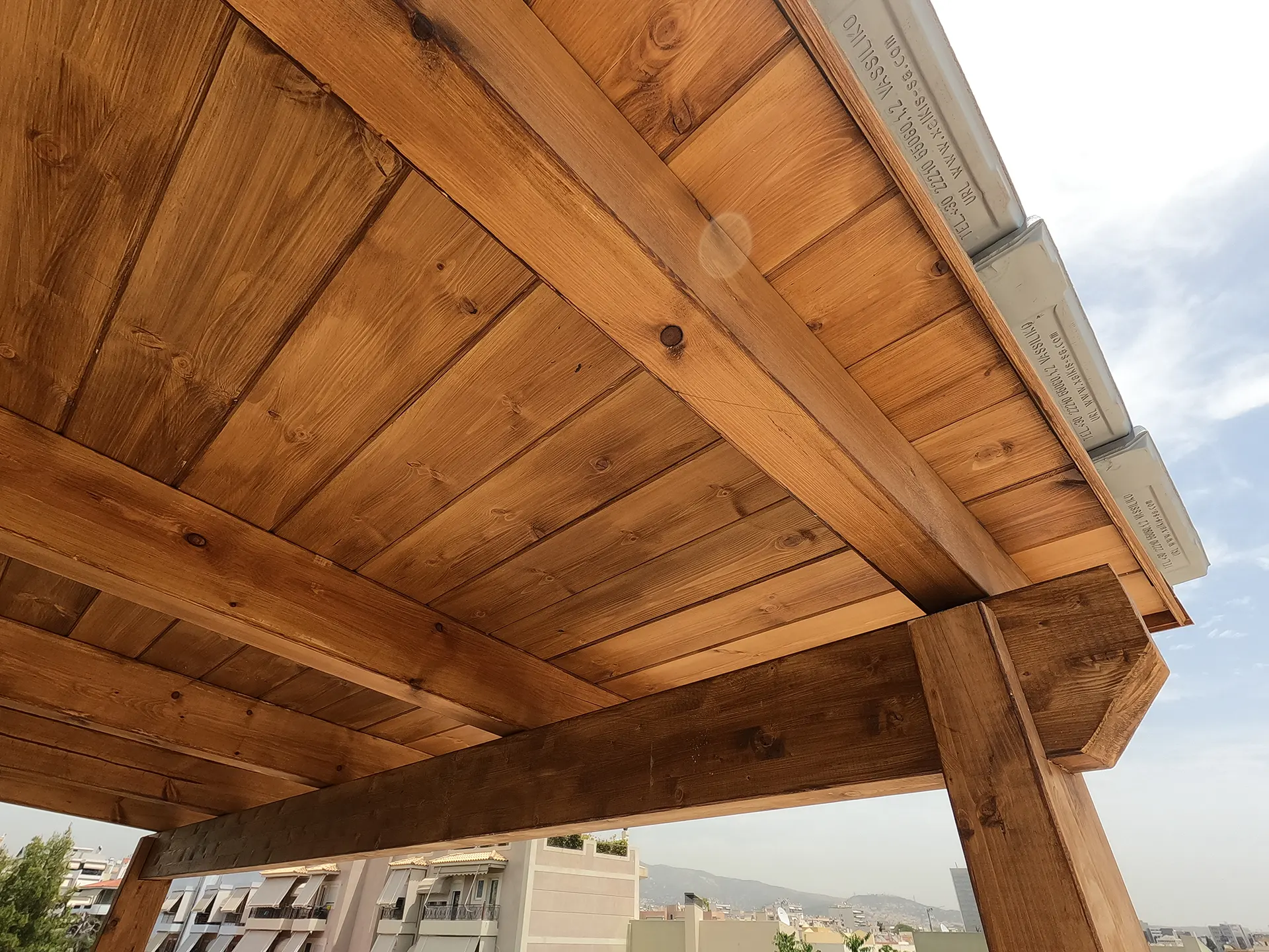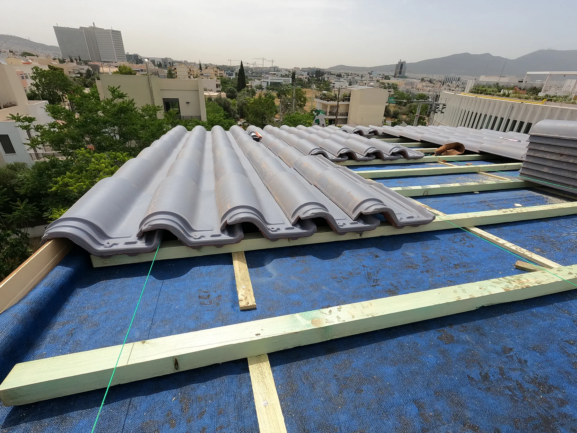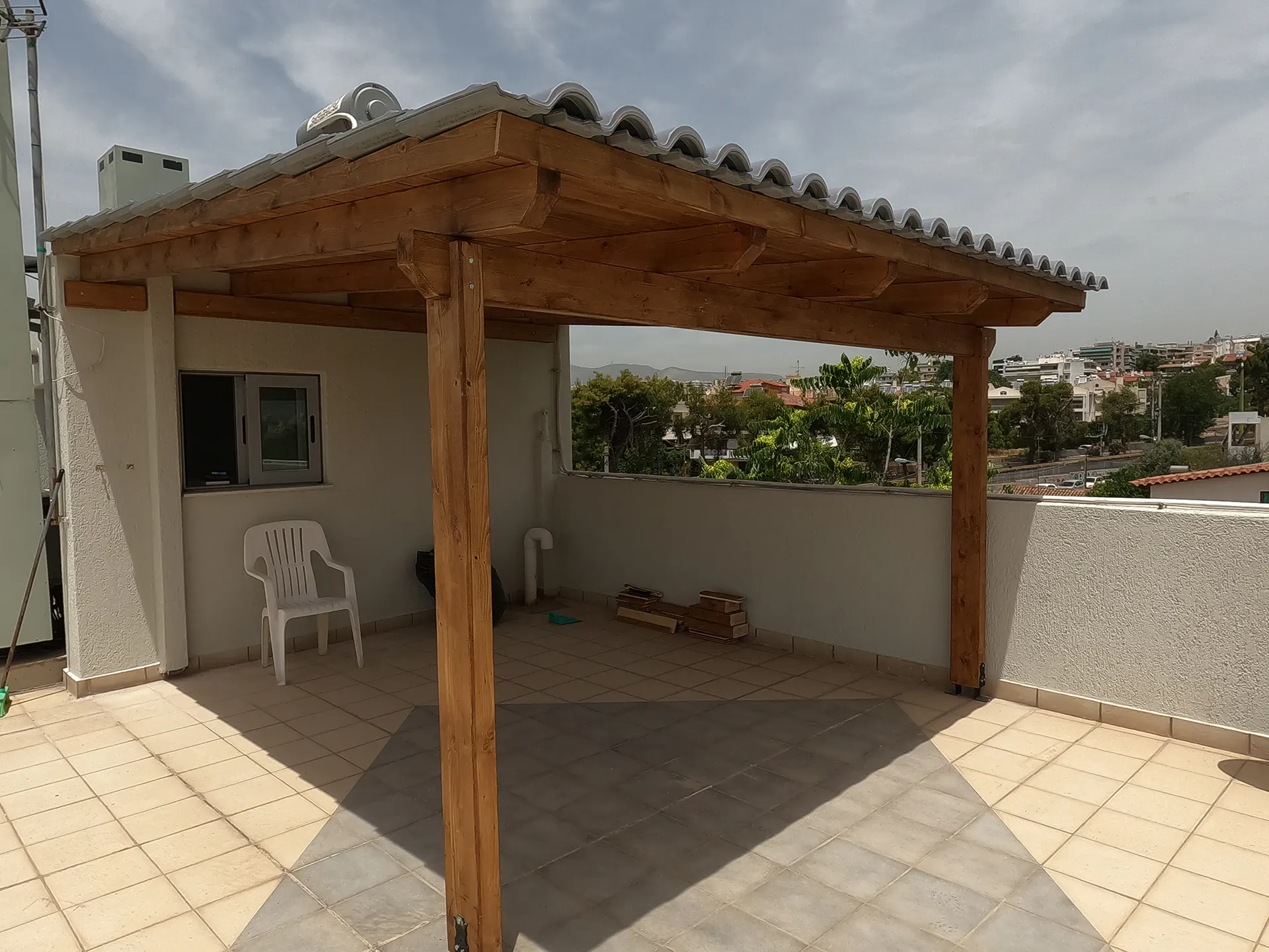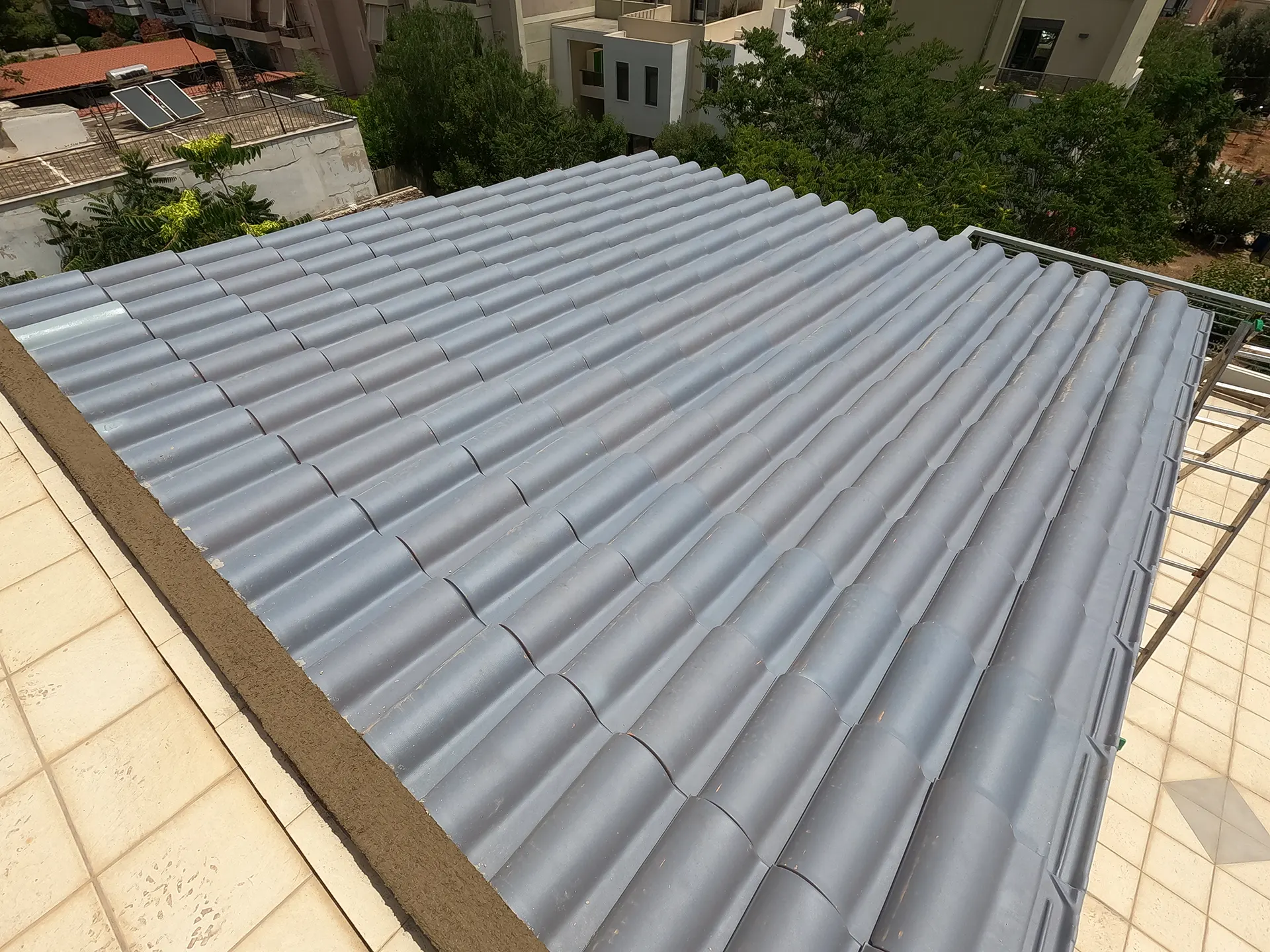 Κατασκευή σκέπαστρου βεράντας σε κατοικία με ανοιχτό γκρι, βαμμένο κεραμίδι ρωμαϊκού τύπου.