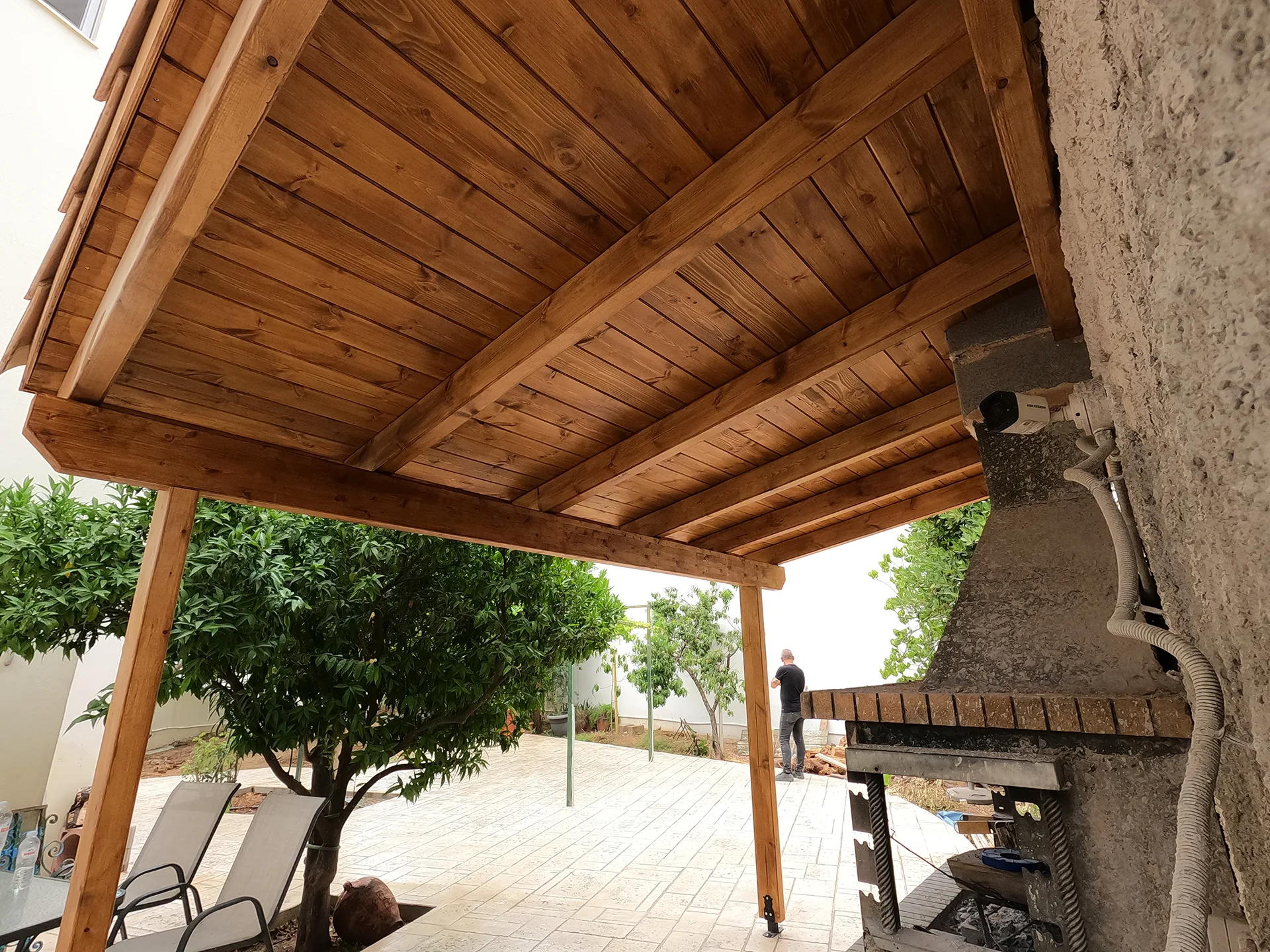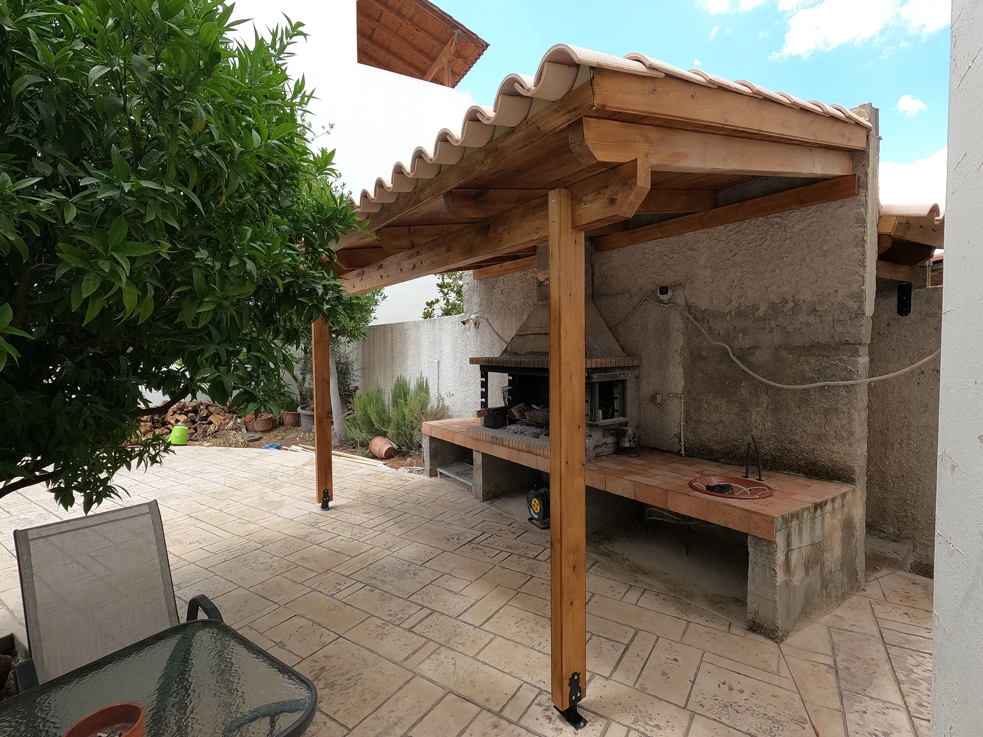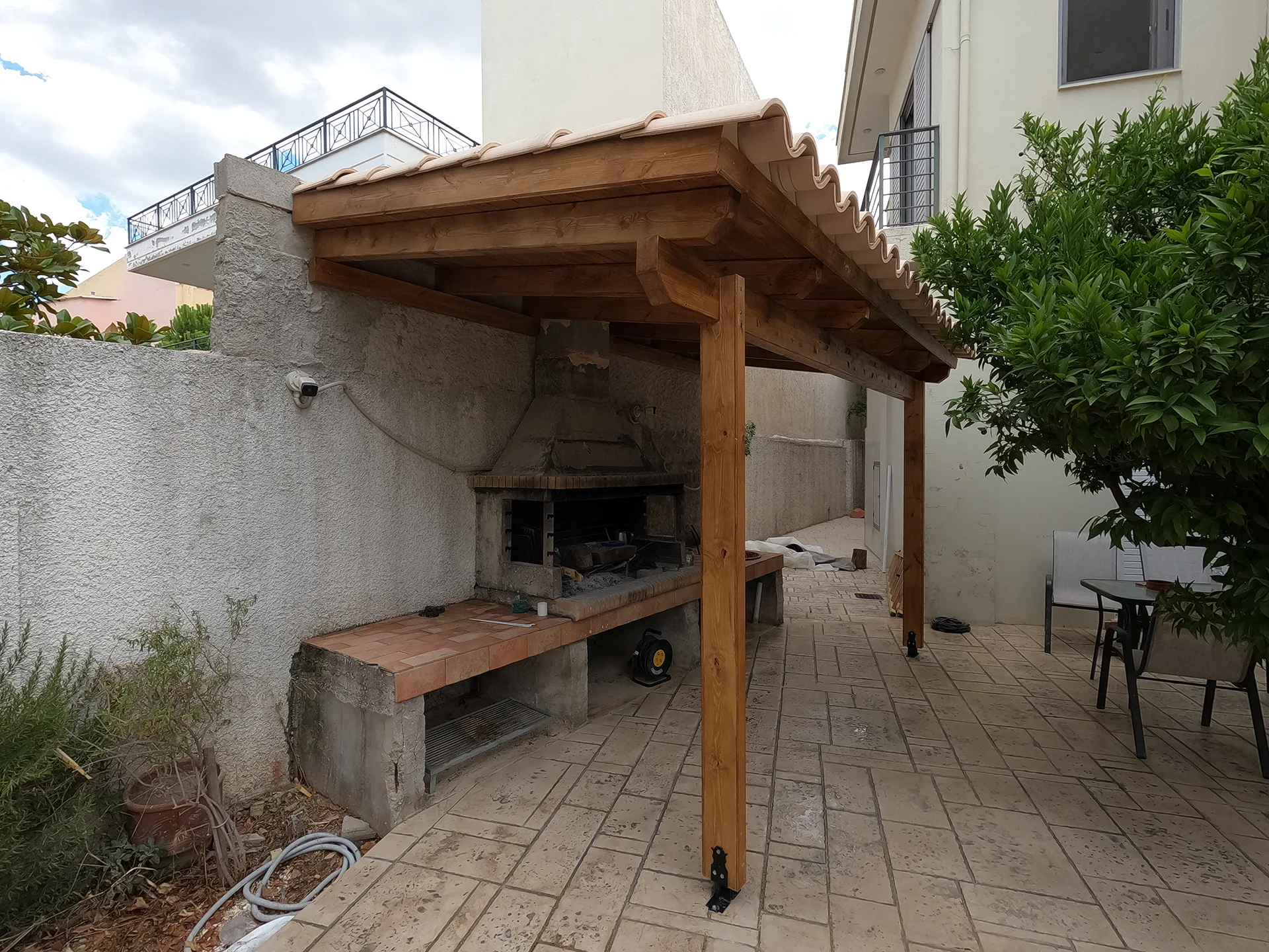 Κατασκευάσαμε σκέπαστρο σε χώρο BBQ στη Χασιά, με βυζαντινά κίτρινα κεραμίδια που αναδεικνύουν τον παραδοσιακό χαρακτήρα και δένουν αρμονικά με το φυσικό περιβάλλον.