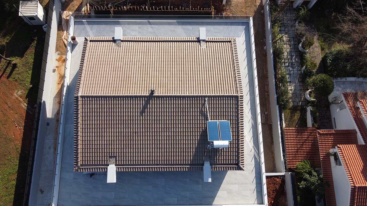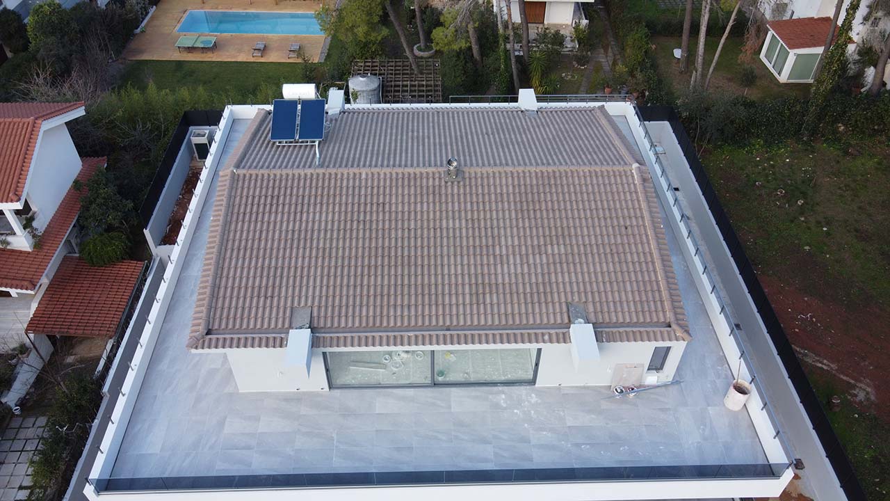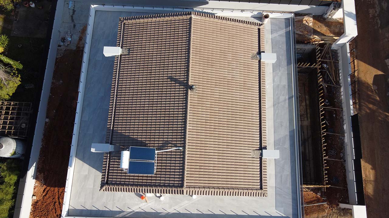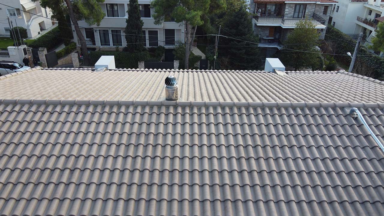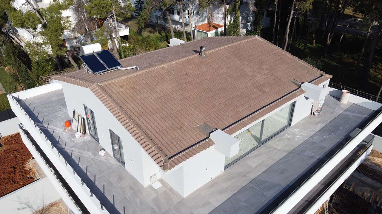 Τοποθέτηση στέγης με ξύλινο σκελετό και καφέ κεραμίδια σε κτίριο στην Εκάλη Αττικής.
