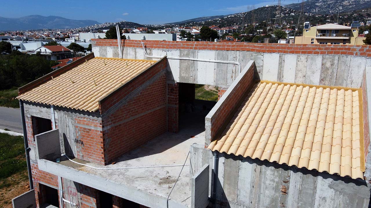 Τοποθέτηση στέγης με ξύλινο σκελετό και κίτρινα κεραμίδια σε κτίριο στη Παλλήνη Αττικής.