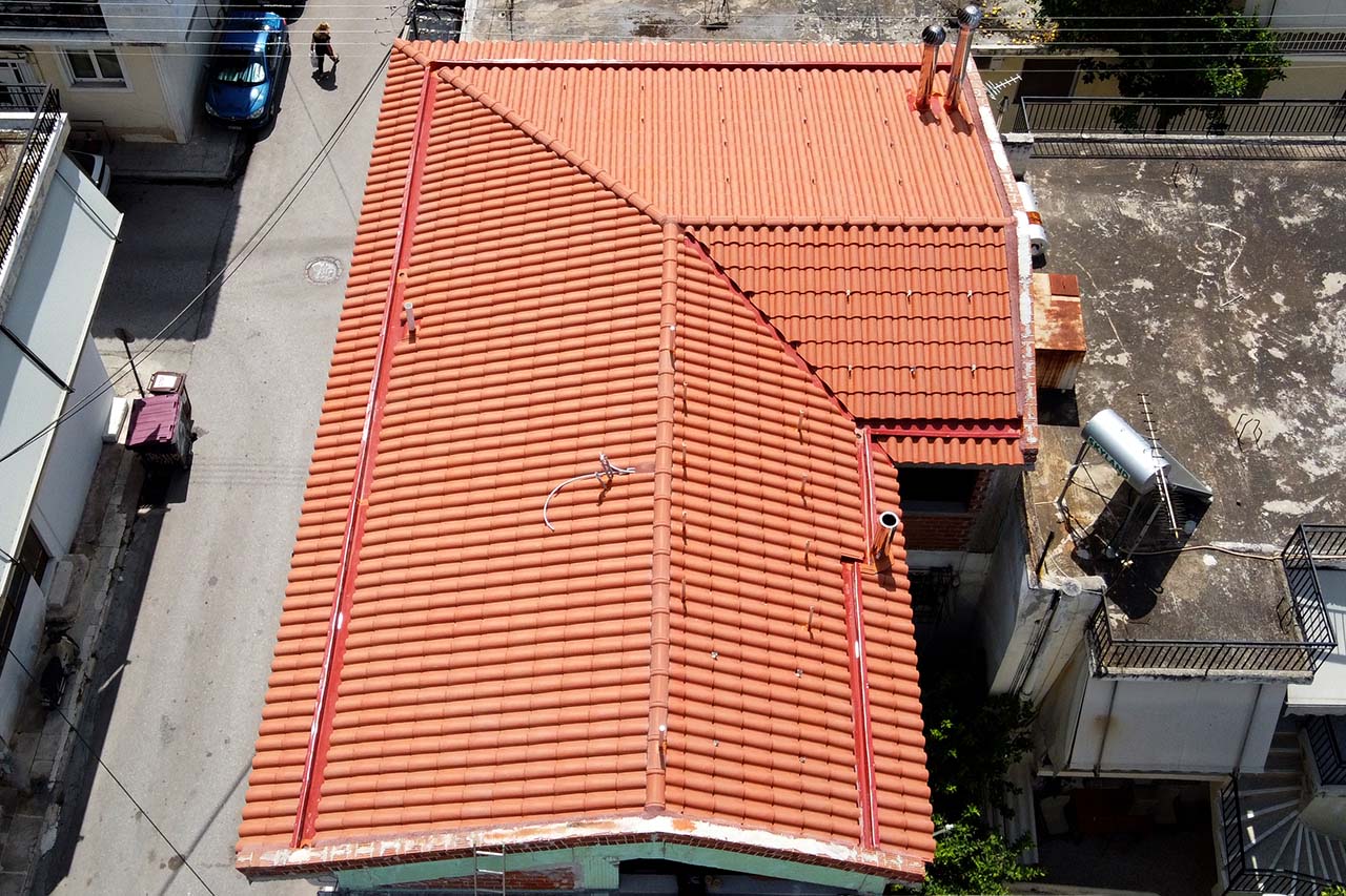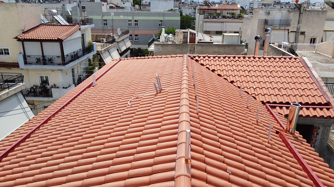 Τοποθέτηση στέγης με ξύλινο σκελετό και κόκκινα κεραμίδια σε κτίριο στο Περιστέρι Αττικής.