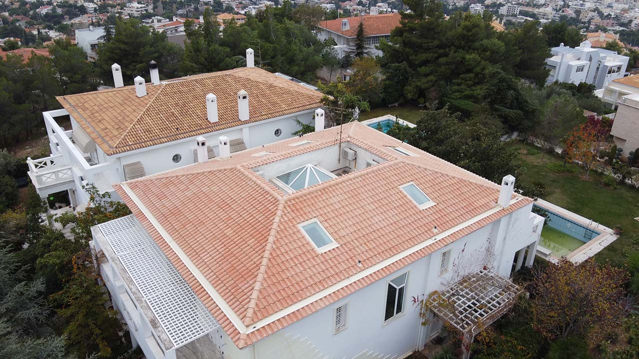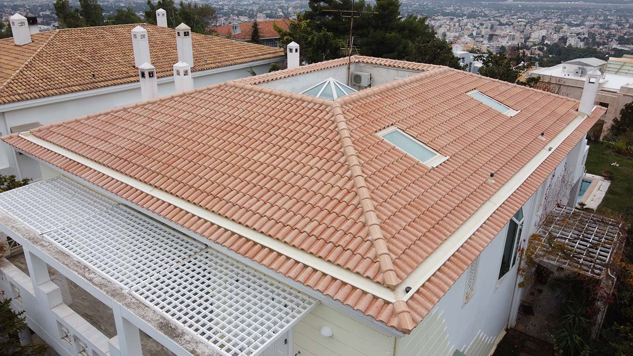 Τοποθέτηση στέγης με ροζ κεραμίδια και εσωτερικό λούκι απόληξης υδάτων στην Ιπποκράτειο Πολιτεία.