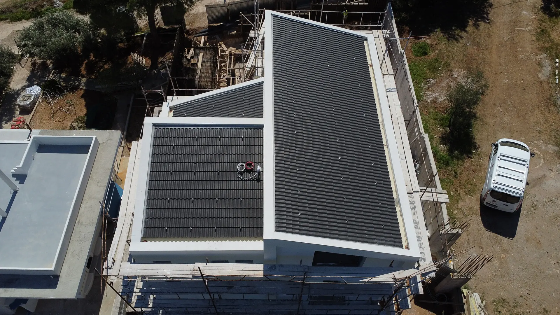 Τα σουηδικού τύπου κεραμίδια Benders, διακρίνονται για την ακρίβεια εφαρμογής, την εξαιρετική αντοχή στον χρόνο και τις ακραίες καιρικές συνθήκες, προσφέροντας παράλληλα κομψότητα και λιτές γραμμές. Η στέγη σχεδιάστηκε με εμφανή ξύλινο σκελετό, κατασκευασμένο από ποιοτική, κατεργασμένη ξυλεία, ενισχύοντας την αίσθηση φυσικότητας στον χώρο. Δόθηκε ιδιαίτερη έμφαση στη σωστή κλίση και στις λεπτομέρειες στεγάνωσης, ώστε η κατασκευή να λειτουργεί άψογα τόσο αισθητικά όσο και τεχνικά. Το τελικό αποτέλεσμα αναδεικνύει τον μοντέρνο χαρακτήρα της κατοικίας, ενώ ταυτόχρονα παραμένει διαχρονικό, συνδυάζοντας αρμονικά τις απαιτήσεις της αισθητικής με τις ανάγκες της καθημερινότητας.