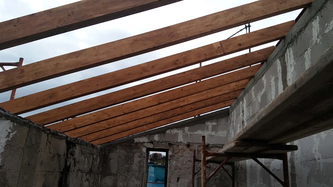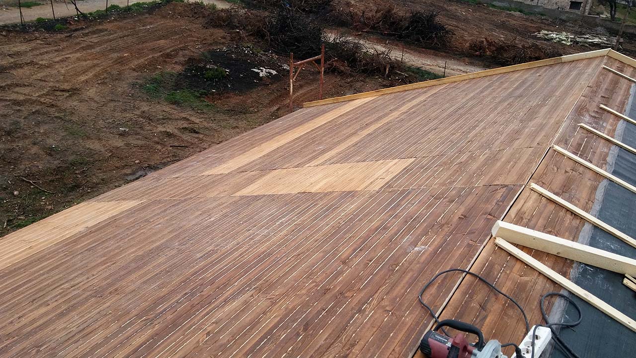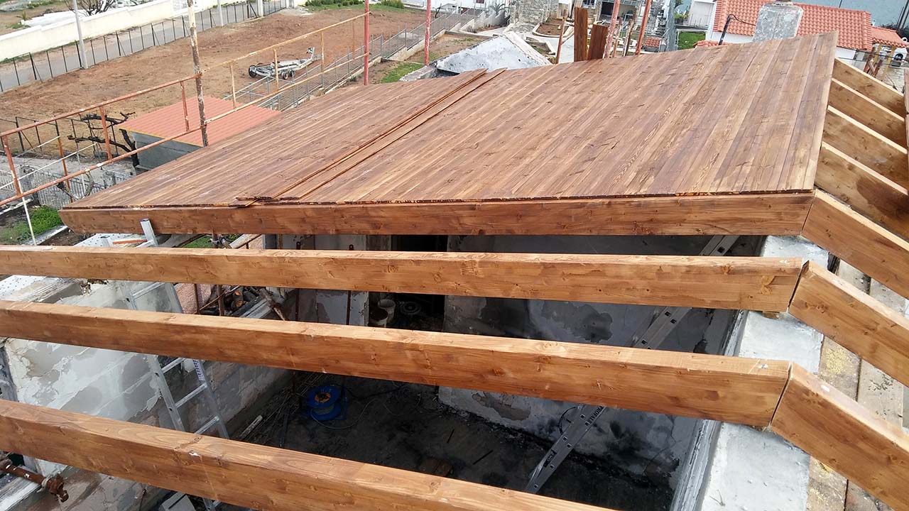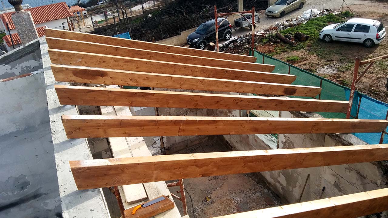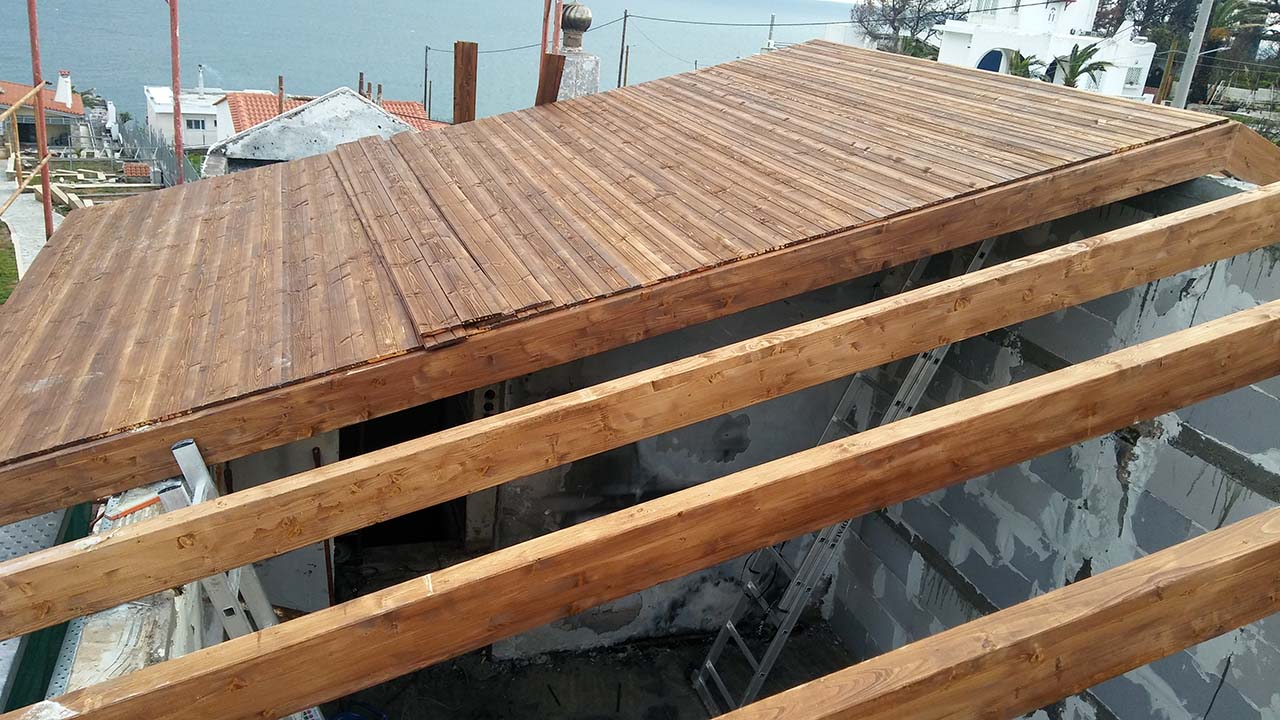 Τοποθέτηση στέγης με εμφανή σκελετό με σύνθετη ξυλεία σε εξοχική κατοικία στο Μάτι Αττικής.