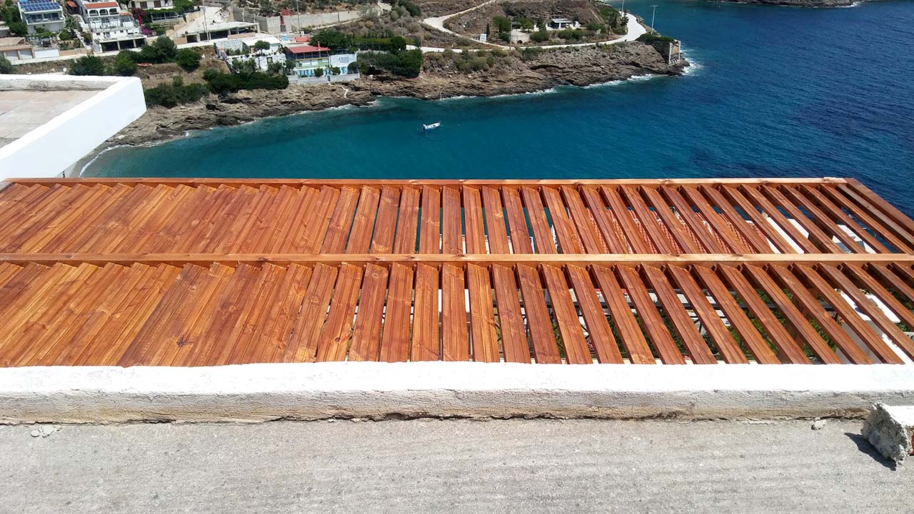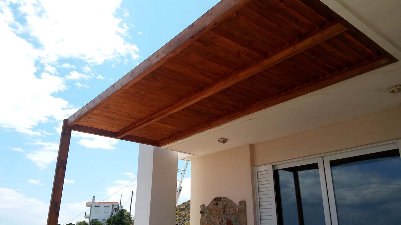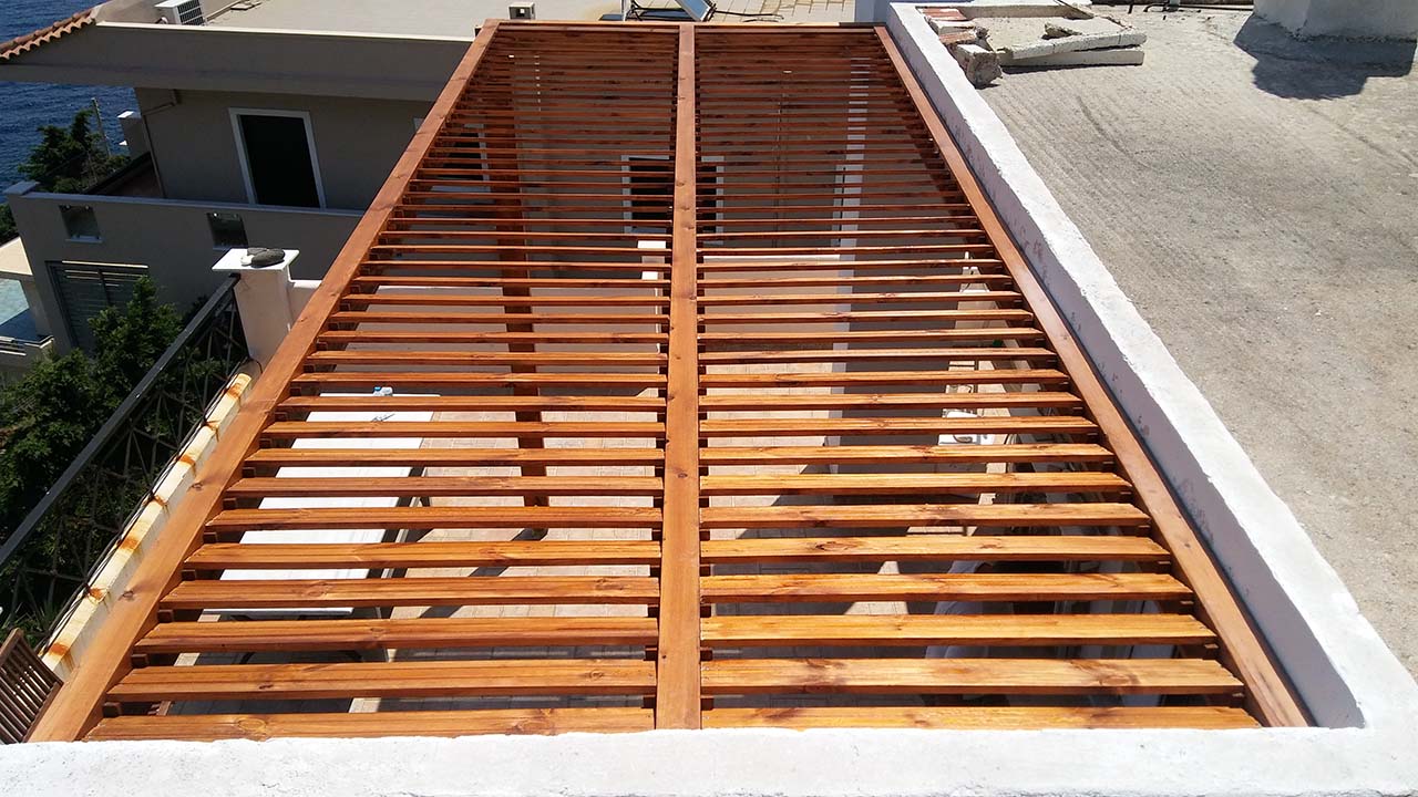 Τοποθέτηση πέργκολας με πλανισμένη ξυλεία πεύκου σε εξοχική κατοικία στο Λαύριο Αττικής.