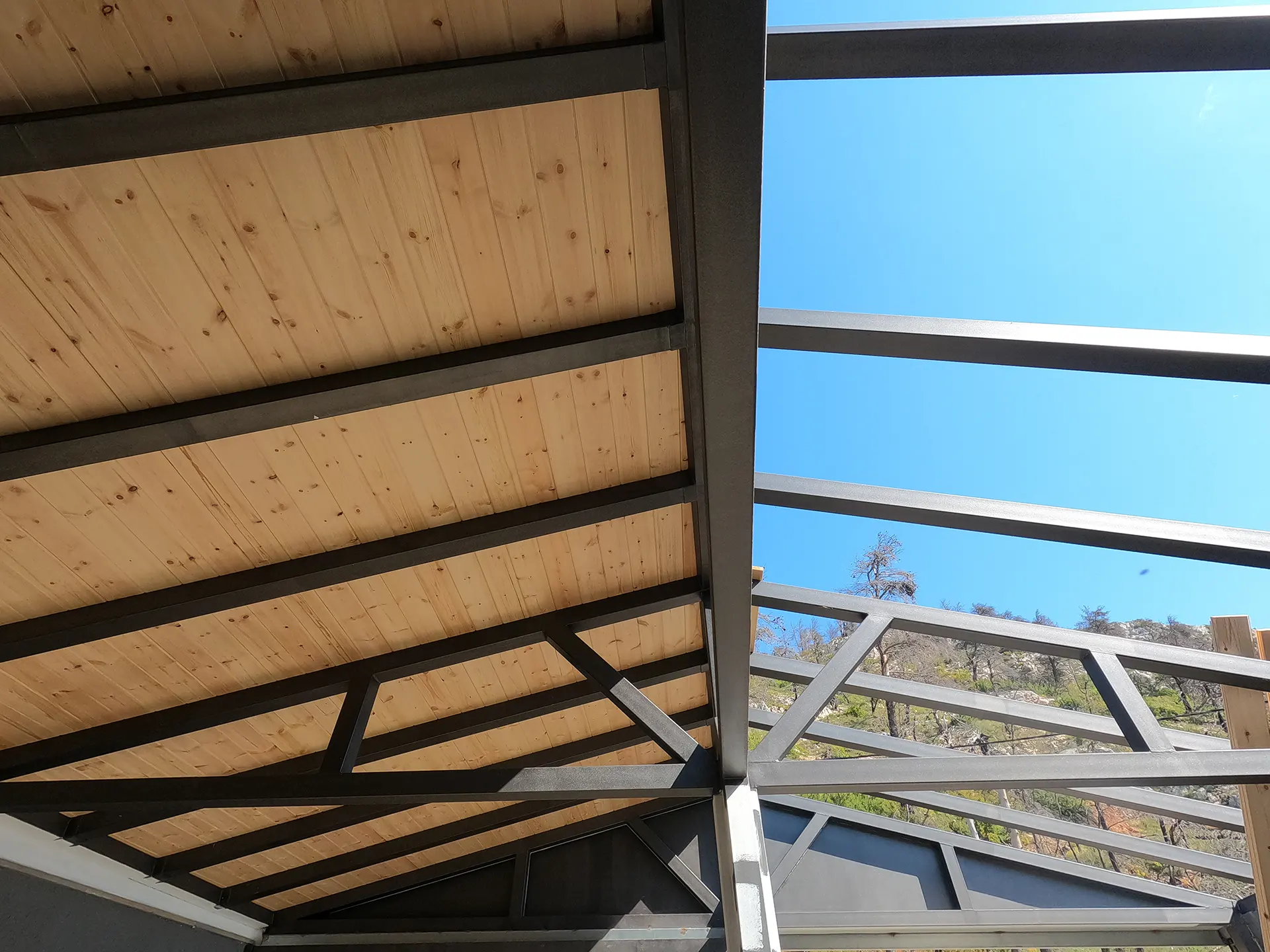 Το ζεστό, φωτεινό κίτρινο κεραμίδι προσδίδει έναν ιδιαίτερο χαρακτήρα στην κατασκευή, δημιουργώντας μια φιλόξενη και ηλιόλουστη αίσθηση που αναδεικνύεται από το φόντο της φύσης. Η χρήση μεταλλικού σκελετού εξασφαλίζει ελαφριά αλλά εξαιρετικά ανθεκτική κατασκευή, ενώ ο συνδυασμός με τα κεραμίδια προσφέρει υψηλό δείκτη μόνωσης και αισθητική ενότητα σε όλη την επιφάνεια. Τα σκέπαστρα των μπαλκονιών σχεδιάστηκαν με προσοχή, ώστε να ακολουθούν τις γραμμές της κύριας στέγης και να ενοποιούνται με το αρχιτεκτονικό ύφος της κατοικίας. Η κατασκευή ολοκληρώθηκε με απόλυτη ακρίβεια, χρησιμοποιώντας ποιοτικά υλικά και σύγχρονες τεχνικές στερέωσης και στεγανοποίησης, διατηρώντας τη λειτουργικότητα και την κομψότητα σε κάθε λεπτομέρεια.